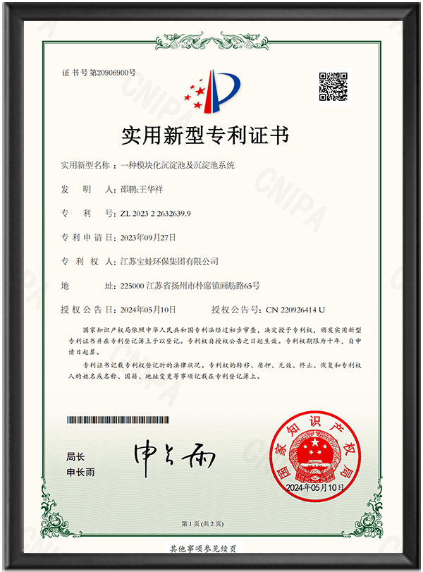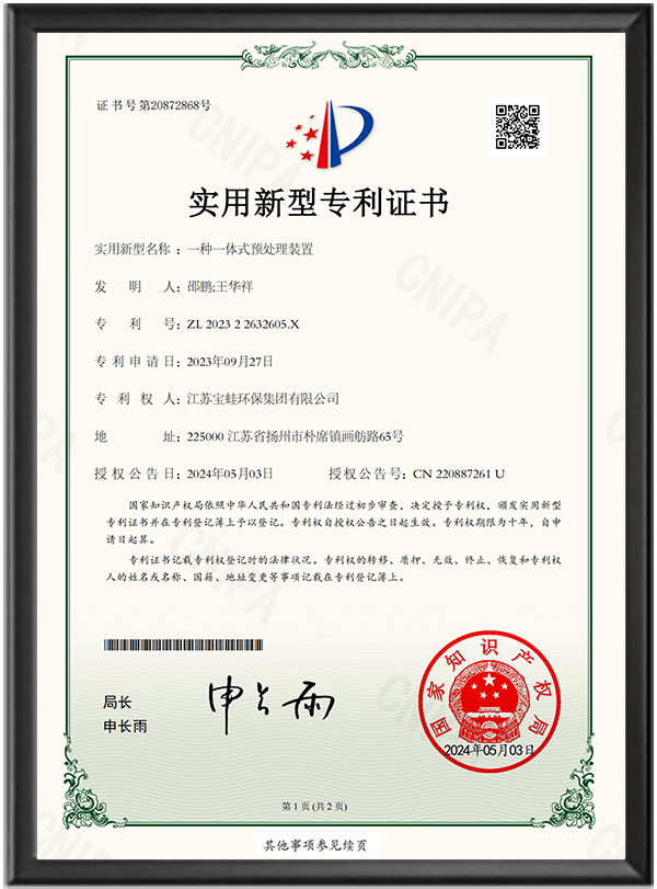 國內(nèi)大中型環(huán)保集團(tuán)--江蘇寶蛙環(huán)保集團(tuán)有限公司,地處中國歷史文化名城揚(yáng)州市經(jīng)濟(jì)技術(shù)開發(fā)區(qū)內(nèi)。首創(chuàng)于 2012 年,注冊資金 10000 萬元人民幣,占地面積 50 畝,總建筑面積 3 萬 5 千多平方米,其中廠房面積 1 萬 9 千多平方米,公司現(xiàn)有員工 200 余人,其中各類專業(yè)技術(shù)人員 30 余人,年產(chǎn)值可達(dá) 5 億元以上。自有激光切割機(jī)、加工中心、大型液壓剪板機(jī)、液壓折彎機(jī)、龍門銑床、立臥式車床、鉆床、各類進(jìn)口焊機(jī)、探傷檢測儀等大中型機(jī)械加工檢測、試驗設(shè)備。并順利通過了 ISO9001:2015 質(zhì)量管理體系認(rèn)證、ISO14001:2015 環(huán)境管理體系認(rèn)證以及 ISO45001:2018 職業(yè)健康安全管理體系認(rèn)證;獲得了“全國工業(yè)產(chǎn)品生產(chǎn)許可證書”、“企業(yè)信用等級 AAA 證書”等榮譽(yù)稱號。健全的管理體系、雄厚的技術(shù)力量先進(jìn)的制造設(shè)備及生產(chǎn)工藝、完善的檢測手段,使公司未來可獲得快速穩(wěn)定的發(fā)展。